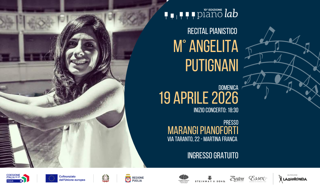 Domenica 19 aprile 2026 alle ore 18:30, presso Marangi Pianoforti a Martina Franca, ti aspetta un emozionante recital pianistico del M° Angelita Putignani.