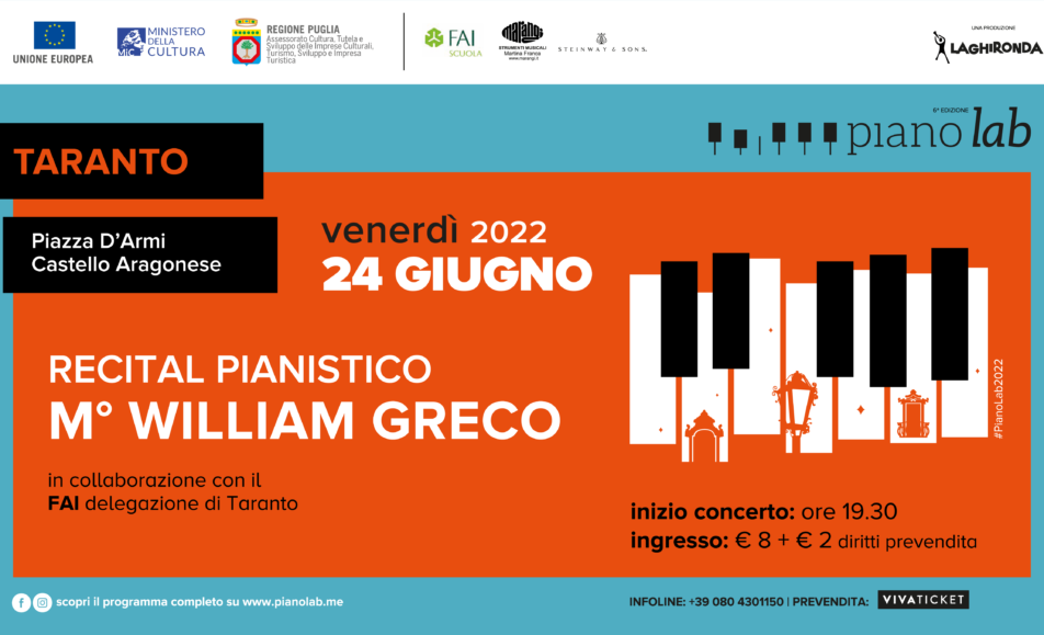 Protagonista della quarta data di Piano Lab 2022 sarà il M° William Greco, il pianista salentino considerato da pubblico e critica come uno dei giovani pianisti più interessanti della sua generazione.